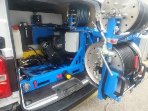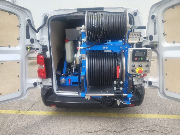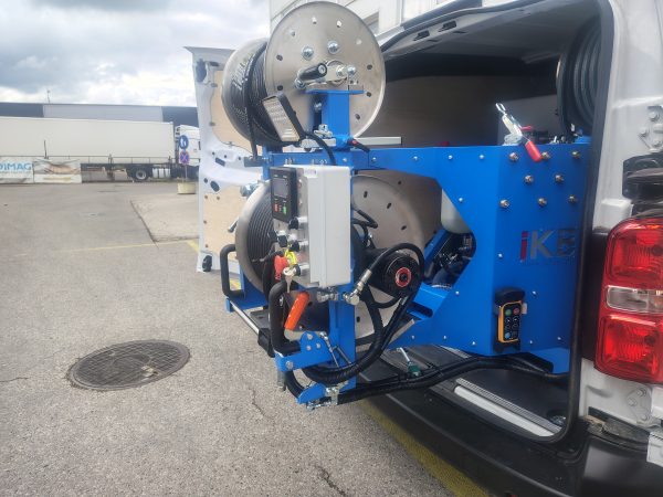 Unikátny dizajn prevzatý s rady HURAGAN využíva umiestnenie až dvoch čistiacich bubnov na výklopnom ramene, ktoré sa horizontálne nakláňa pod uhlom 90 stupňov. Bubon je tiež možné otočiť o 180 stupňov. Vysokotlaková pracovná hadica je namontovaná na hydraulicky poháňanom bubne s plynulým nastavovaním rýchlosti navíjania/odvíjania, s priemerom DN 16 mm, dĺžkou 80 m a vybavená spojkami ¾” alebo ½” (podľa želania zákazníka). Na ramene je umiestnený aj samotný ovládací panel s displejom a tlačidlami pre ovládanie ako aj bez-kľúčové štartovanie stroja a tak má obsluha všetko potrebné pre ovládania stroja pred sebou. V prípade obsluhy iba jednou osobou vysokotlakové zariadenie TAJFUN disponuje aj najmodernejším diaľkovým ovládaním a LED svietidlom na konci ramena pre osvetlenie pracovného priestoru nad šachtou.